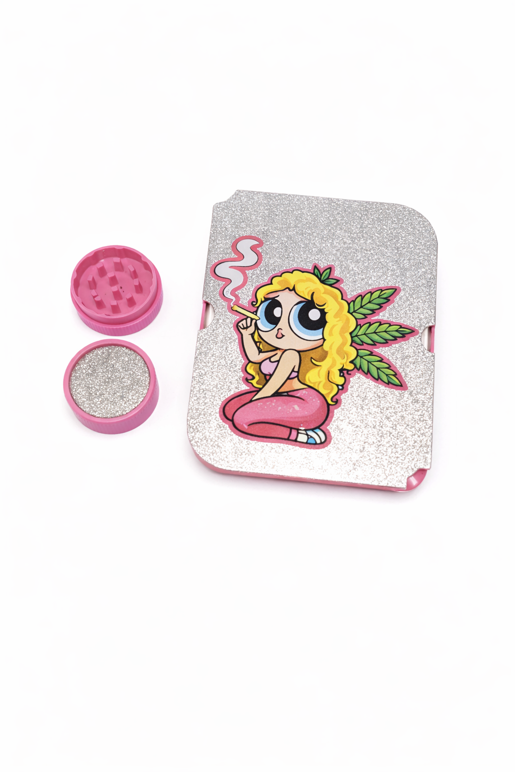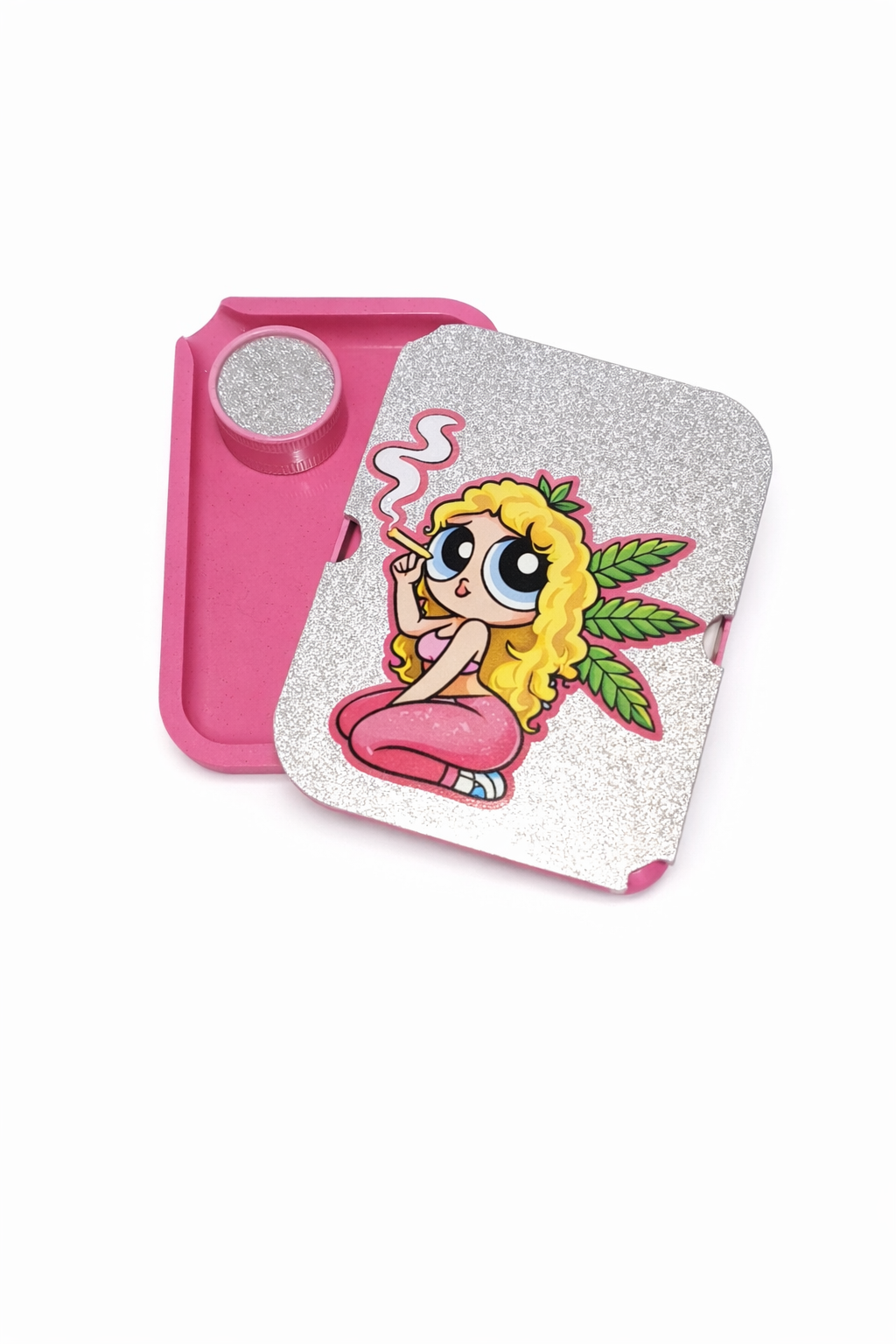De glitter deksel met Blonde Girl Smoking design geeft deze set een speelse maar krachtige uitstraling cute, maar zeker niet basic.
