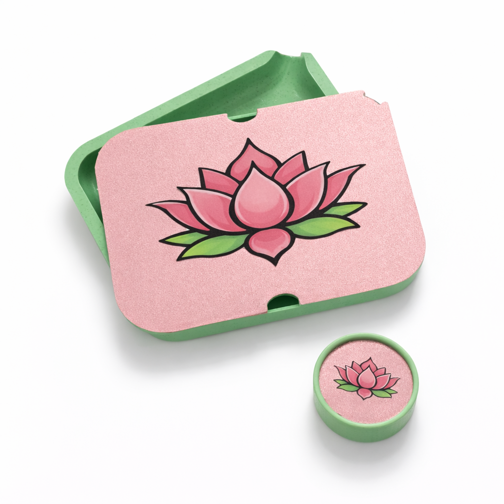 Een rustige en vrouwelijke set met lotusdesign in roze en groen. De combinatie van zachte kleuren en glitter geeft deze set een luxe, kalme uitstraling.
